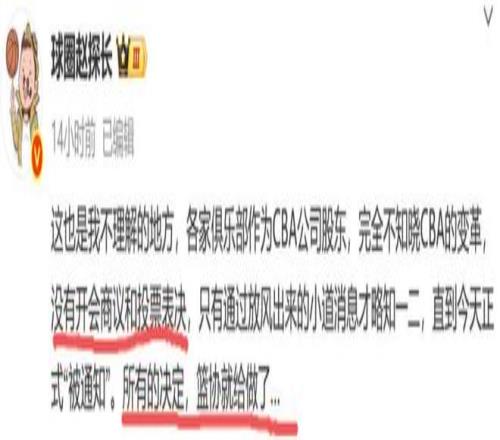 另外球圈赵探长也表示:“这也是我不理解的地方,各家俱乐部作为CBA公司股东,完全不知晓CBA的变革,没有开会商议和投票表决,只有通过放风出来的小道消息才略知一二,直到11月17日正式“被通知”。所有的决定,都是篮协直接就给做了。”