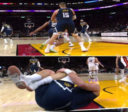 从慢镜头回看,小哈克斯持球突破,斯宾塞·琼斯重心失衡,整个人往后退了一步;就是这没有任何恶意的一步,却异常精准的直接踩在了约基奇左脚上。