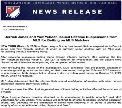 据美职联描述:“在通过诚信合作伙伴收到可疑投注预警后,MLS委托帕特森·贝尔纳普·韦伯&泰勒律师事务所(Patterson Belknap Webb & Tyler LLP)展开调查,相关球员在此期间被停赛,等待调查结果出炉。在审阅调查结果后,MLS认定,这两名球员在2024和2025赛季期间,广泛参与足球博彩,其中包括投注自己所属球队的比赛。在其中一起事件中,两人均投注琼斯会在2024年10月19日的一场比赛中吃到黄牌,琼斯本人也因此获得了相关投注收益。MLS还认定,这两名球员很可能向其他投注者分享了关于自己故意吃黄牌意图的机密信息。目前没有证据表明,这些投注活动影响了任何一场比赛的最终结果。”
